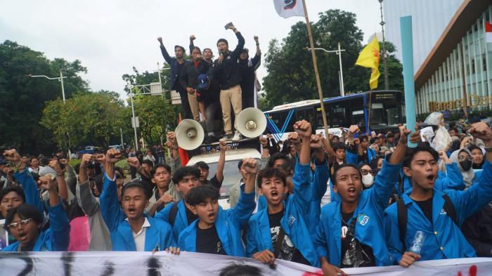 Sejak siang, massa mulai bergerak dari berbagai titik membawa spanduk maupun poster untuk mengiringi orasi yang menyerukan tuntutan mereka.